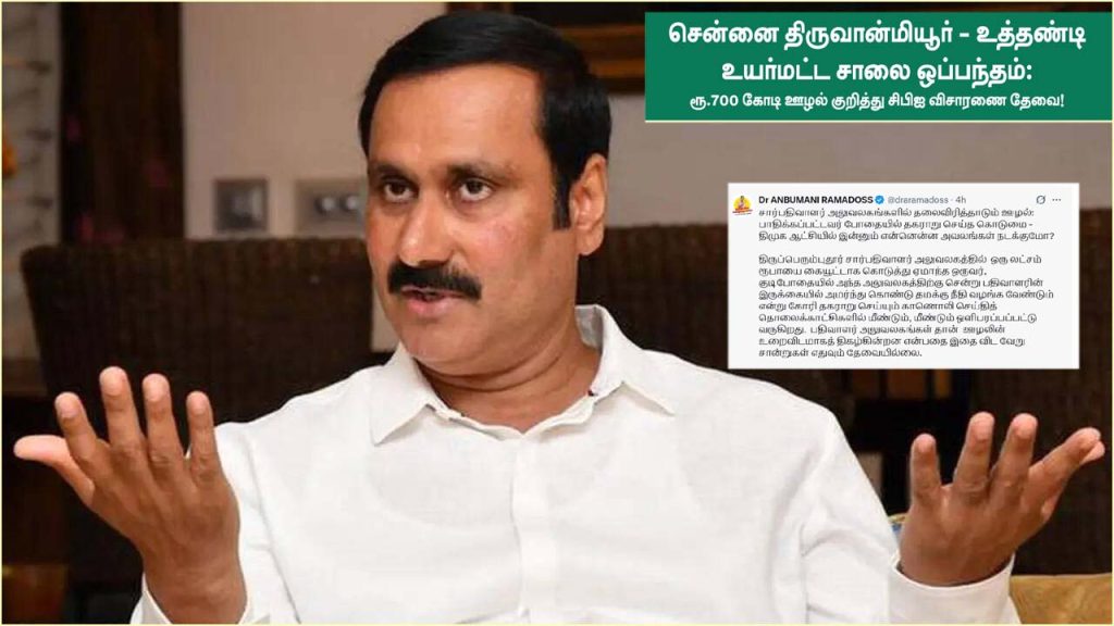 சென்னை: திமுக ஆட்சியில் சார்பதிவாளர் அலுவலகங்களில் ஊழல் தலைவிரித்தாடுகிறது என்றும், திருவான்மியூர் – உத்தண்டி சாலை ஒப்பந்தம் போட்டதில் ரூ.700 கோடி ஊழல் நடைபெற்று உள்ளதாகவும், இது குறித்து சிபிஐ விசாரிக்க வேண்டும் என பாமக தலைவர் அன்புமணி ராமதாஸ் வலியுறுத்திஉள்ளார்.
