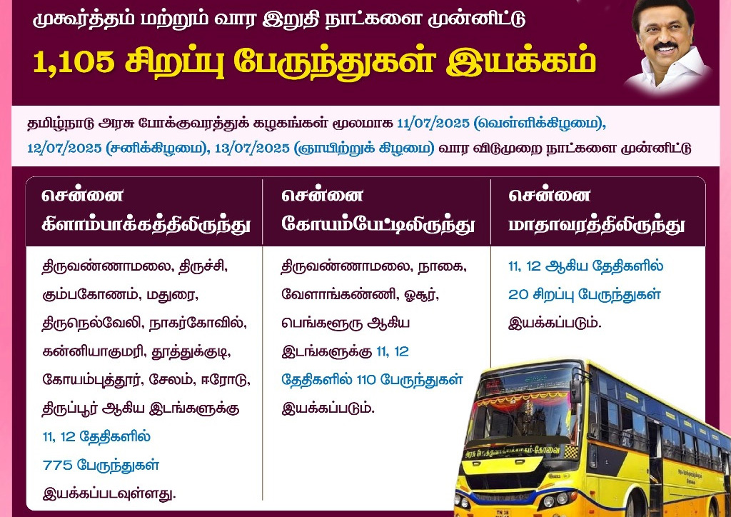 சென்னை கிளாம்பாக்கத்திலிருந்து திருவண்ணாமலை, திருச்சி, கும்பகோணம், மதுரை, திருநெல்வேலி, நாகர்கோவில், கன்னியாகுமரி, தூத்துக்குடி, கோயம்புத்தூர், சேலம், ஈரோடு, திருப்பூர் ஆகிய இடங்களுக்கு 11/07/2025 (வெள்ளிக்கிழமை) அன்று 360 பேருந்துகளும், 12/07/2025 (சனிக்கிழமை) 415 பேருந்துகளும் இயக்க திட்டமிடப்பட்டுள்ளது.