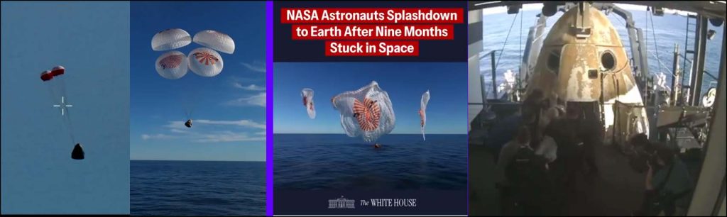 கடந்த ஆண்டு ஜூன் 5 ஆம் தேதி போயிங் ஸ்டார்லைனரில் விண்வெளிக்குச் சென்ற அவர்கள் இன்று காலை ஸ்பேஸ்எக்ஸின் டிராகன் விண்கலத்தில் திரும்பியுள்ளனர். புளோரிடா கடற்கரையில் கடலில் தெறிப்பதற்கு முன்பு விண்வெளி காப்ஸ்யூல் அதன் பாராசூட்டை நிலைநிறுத்தியது.