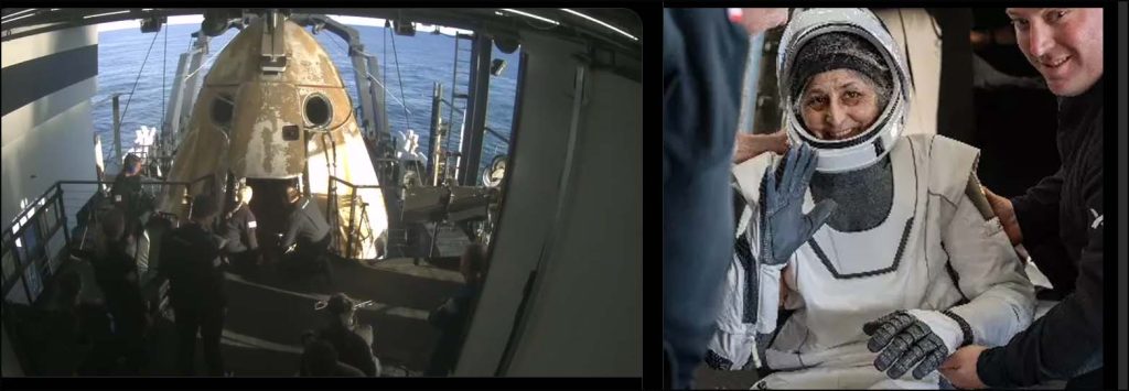 அமெரிக்க விண்வெளி விராங்கனையான சுனிதா வில்லியம்ஸ் மற்றும் புட்ச் வில்மோர் ஆகியோர் கடந்த ஆண்டு ஜூன் 5 ஆம் தேதி போயிங் ஸ்டார்லைனர் மூலம் விண்வெளி நிலையத்திற்கு பறந்து சென்ற நிலையில், சுமார் 9 மாதம் அங்கு பணியாற்றிய நிலையில், இன்று காலை ஸ்பேஸ்எக்ஸின் டிராகன் விண்கலத்தில் பத்திரமாக பூமிக்கு திரும்பினர்.