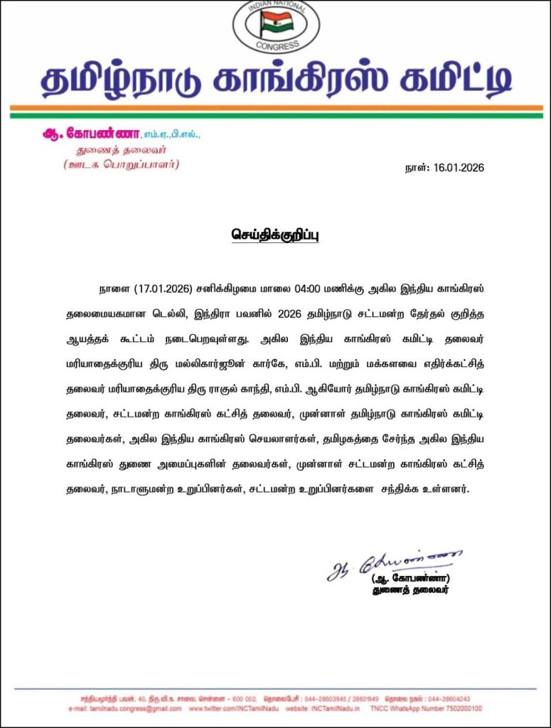 இதுதொடர்பாக  தமிழ்நாடு காங்கிரஸ் கமிட்டி துணைத்தலைவர் கோபண்ணா வெளியிட்டுள்ள செய்திக்குறிப்பில்,  இன்று (17.01.2026) சனிக்கிழமை மாலை 04:00 மணிக்கு அகில இந்திய காங்கிரஸ் தலைமையகமான டெல்லி, இந்திரா பவனில் 2026 தமிழ்நாடு சட்டமன்ற தேர்தல் குறித்த ஆயத்தக் கூட்டம் நடைபெறவுள்ளது.