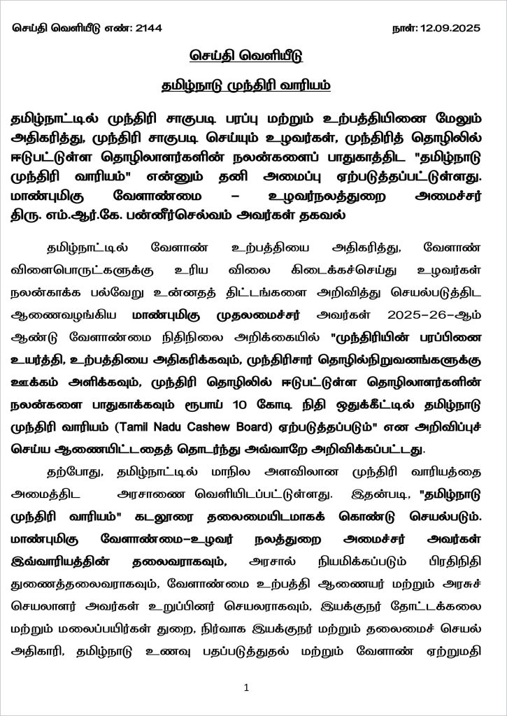 சென்னை: தமிழ்நாடு முந்திரி வாரியம் என தனி வாரியம் உருவாக்கம் செய்து தமிழ்நாடு அரசு அறிவிப்பு வெளியிட்டு உள்ளது. இதன் தலைவராக வேளாண்துறை அமைச்சர் இருப்பார் என்றும் தெரிவிக்கப்பட்டுள்ளது.