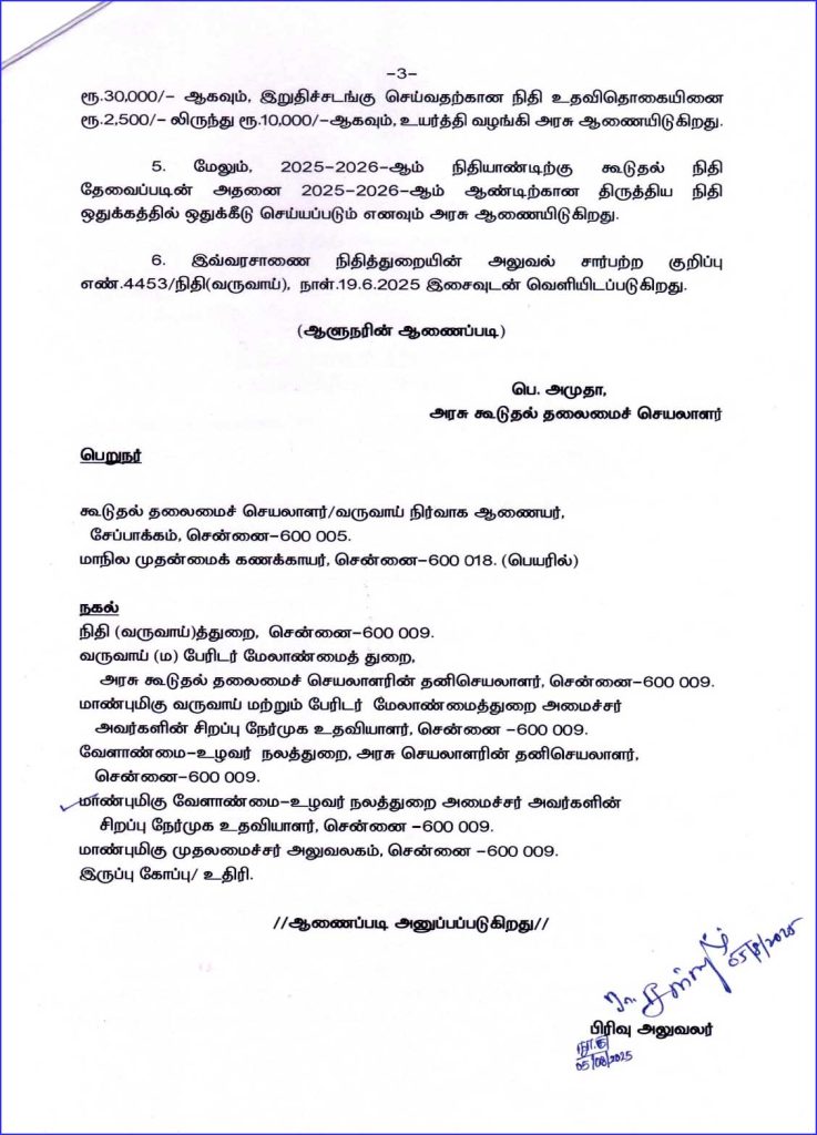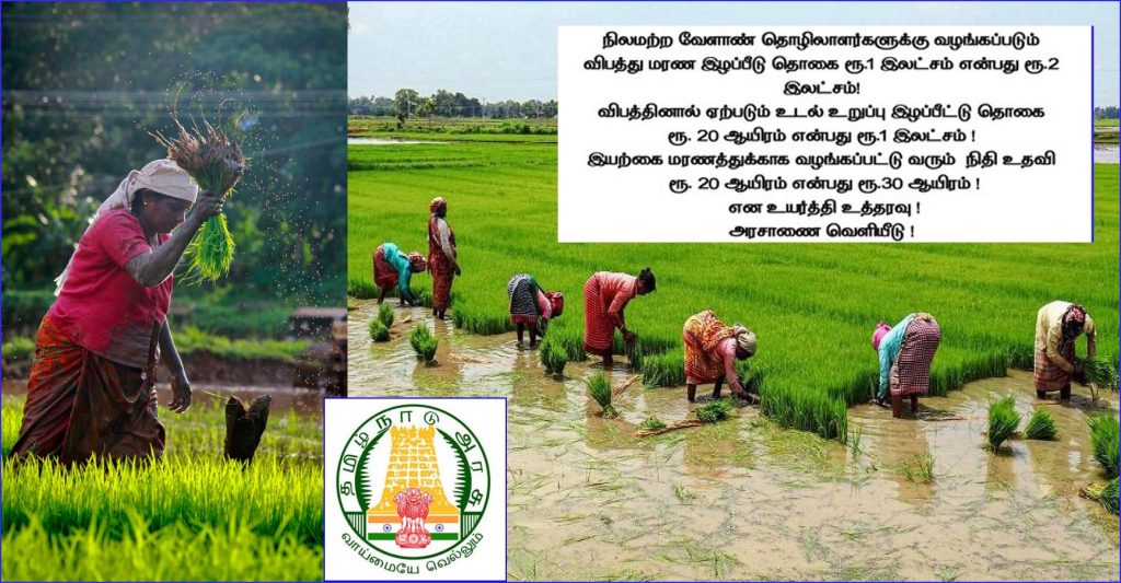 இது குறித்து கூடுதல் தலைமைச்செயலாளர் /வருவாய் நிர்வாக ஆணையர் அவர்களின் கருத்துருவினை அரசு கவனமாக ஆய்வு செய்து, 2025-2026-ஆம் ஆண்டிற்கான வேளாண்மை-உழவர் நலத்துறையின் நிதிநிலை அறிக்கையில் வேளாண்மை-உழவர் நலத்துறை அமைச்சர் அவர்களின் அறிவிப்பின்படி, நிலமற்ற வேளாண் தொழிலாளர்களுக்கு ஒன்றில் படிக்கப்பட்ட அரசாணையில் வெளியிடப்பட்ட நிபந்தனைகளுக்குட்பட்டு விபத்து மரணத்துக்கான இழப்பீட்டு தொகையினை ரூ.1.00.000/-லிருந்து ரூ.2,00,000/- ஆகவும், விபத்தினால் ஏற்படும் உடல் உறுப்பு இழப்பிற்கு நிதிஉதவி தொகையினை ரூ.20,000/- லிருந்து ரூ.1,00,000/-ஆகவும். இயற்கை மரணத்துக்கான நிதி உதவி தொகையினை ரூ.20.000/- லிருந்து ரூ.30,000/- ஆகவும், இறுதிச்சடங்கு செய்வதற்கான நிதி உதவிதொகையினை ரூ.2,500/- லிருந்து ரூ.10,000/-ஆகவும், உயர்த்தி வழங்கி அரசு ஆணையிடுகிறது” .