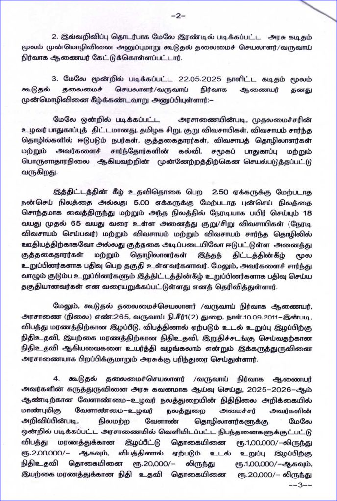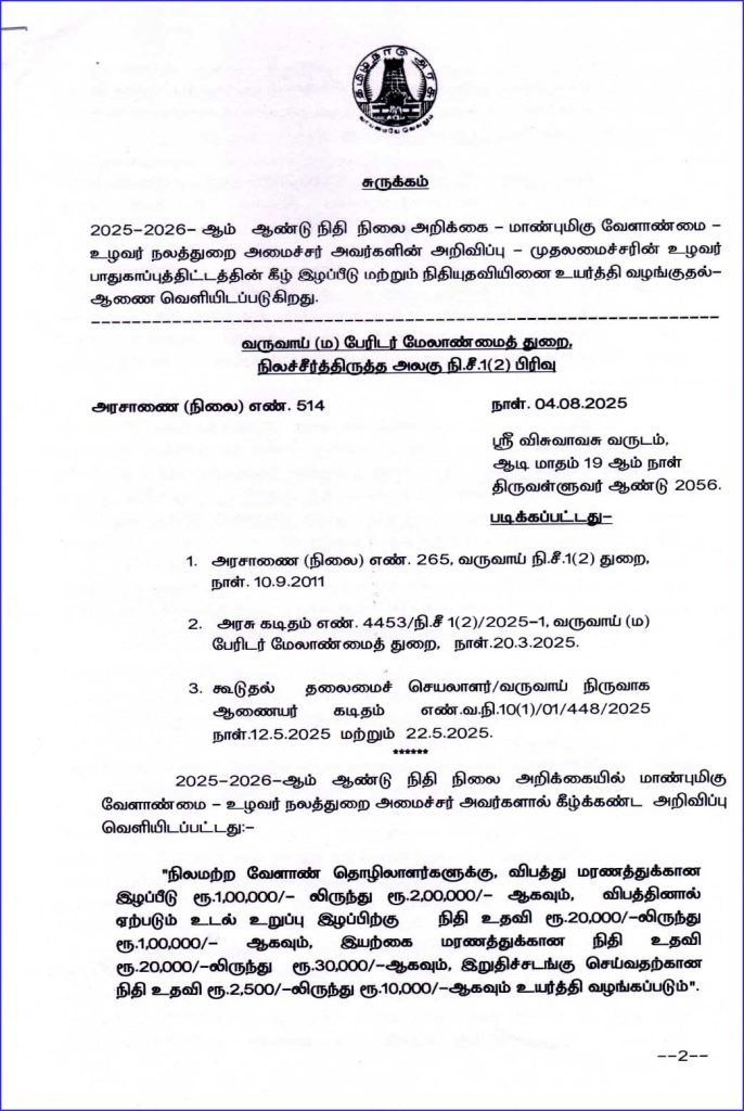 இது குறித்து கூடுதல் தலைமைச்செயலாளர் /வருவாய் நிர்வாக ஆணையர் அவர்களின் கருத்துருவினை அரசு கவனமாக ஆய்வு செய்து, 2025-2026-ஆம் ஆண்டிற்கான வேளாண்மை-உழவர் நலத்துறையின் நிதிநிலை அறிக்கையில் வேளாண்மை-உழவர் நலத்துறை அமைச்சர் அவர்களின் அறிவிப்பின்படி, நிலமற்ற வேளாண் தொழிலாளர்களுக்கு ஒன்றில் படிக்கப்பட்ட அரசாணையில் வெளியிடப்பட்ட நிபந்தனைகளுக்குட்பட்டு விபத்து மரணத்துக்கான இழப்பீட்டு தொகையினை ரூ.1.00.000/-லிருந்து ரூ.2,00,000/- ஆகவும், விபத்தினால் ஏற்படும் உடல் உறுப்பு இழப்பிற்கு நிதிஉதவி தொகையினை ரூ.20,000/- லிருந்து ரூ.1,00,000/-ஆகவும். இயற்கை மரணத்துக்கான நிதி உதவி தொகையினை ரூ.20.000/- லிருந்து ரூ.30,000/- ஆகவும், இறுதிச்சடங்கு செய்வதற்கான நிதி உதவிதொகையினை ரூ.2,500/- லிருந்து ரூ.10,000/-ஆகவும், உயர்த்தி வழங்கி அரசு ஆணையிடுகிறது” .