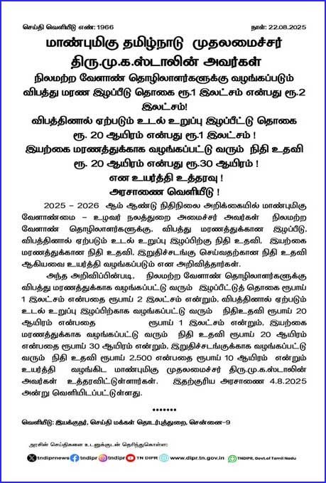 இது குறித்து வேளாண்மை உழவர் நலத்துறை அமைச்சகம் சார்பில் வெளியிடப்பட்டுள்ள அறிக்கையில், “2025-2026-ஆம் ஆண்டு நிதி நிலை அறிக்கையில் வேளாண்மை உழவர் நலத்துறை அமைச்சர் எம்.ஆர்.கே. பன்னீர்செல்வம், “நிலமற்ற வேளாண் தொழிலாளர்களுக்கு, விபத்து மரணத்துக்கான இழப்பீடு ரூ.1,00,000/- லிருந்து ரூ.200,000/- ஆகவும், விபத்தினால் ஏற்படும் உடல் உறுப்பு இழப்பிற்கு நிதி உதவி ரூ.20,000/-லிருந்து ரூ.1,00,000/- ஆகவும், இயற்கை மரணத்துக்கான நிதி உதவி ரூ.20,000/-லிருந்து ரூ.30,000/-ஆகவும், இறுதிச்சடங்கு செய்வதற்கான நிதி உதவி ரூ.2,500/-லிருந்து ரூ.10,000/-ஆகவும் உயர்த்தி வழங்கப்படும்”என்று அறிவித்தார்.