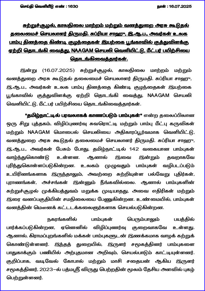 உலக பாம்புகள் தினம் ஜுலை 16ந்தேதி கொண்டாடப்படும் நிலையில், அன்றைய தினம், சென்னையில் நடைபெற்ற நிகழ்ச்சியில், தமிழக வனத்துறைச் செயலாளர் சுப்ரியா சாஹு நாகம் செயலியை வெளியிட்டார்.