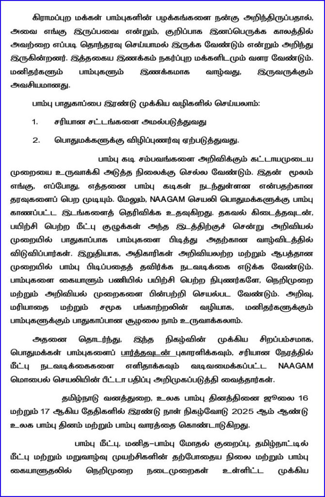 பொதுமக்கள் பாம்புகளை பார்த்தவுடன் புகார் அளித்து, உரிய நேரத்தில் மீட்பு நடவடிக்கையை உறுதி செய்யும் வகையில் நாகம் செயலி மூலம் புகாரின் பேரில் பயிற்சி பெற்ற மீட்புக் குழுவினர் சம்பவ இடத்திற்கு விரைந்து சென்று, அறிவியல் முறையில் பாம்புகளை பிடித்து, அதற்கான வாழ்விடத்தில் விடுவர்.