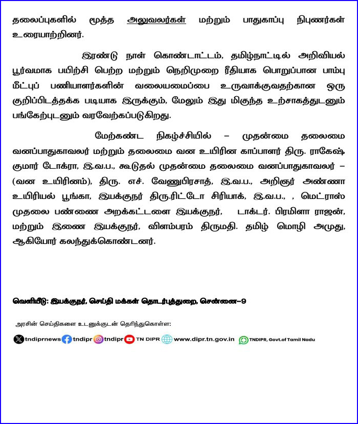 “பாம்பு கடி என்பது, அறிவிக்கப்பட வேண்டிய நோய்களின் பட்டியலில் இப்போது சேர்க்கப்பட்டுள்ளது. அதேபோல், மீட்பு நடவடிக்கையில் ஈடுபடுவோர், முன்னெச்சரிக்கை நடவடிக்கை குறித்து முழுமையாக அறிந்திருக்க வேண்டும்,” என்றார் சுப்ரியா சாஹு . இருளர் சமூகத்தினர் இந்தப் பணியை சிறப்பாக செய்து வருவதாகக் குறிப்பிட்ட அவர், தமிழகத்தைச் சேர்ந்த வடிவேல் கோபால், மாசி சடையன் ஆகியோர் பாம்பு மீட்பு, விழிப்புணர்வுக்காக தங்கள் வாழ்வை அர்ப்பணித்து, பத்மஸ்ரீ விருது பெற்று பெருமை சேர்த்துள்ளதாகத் தெரிவித்தார்.