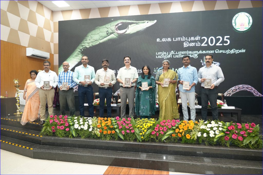 சுற்றுச்சூழல், காலநிலை மாற்றம் (ம) வனத்துறை அரசு கூடுதல் தலைமைச் செயலாளர் திருமதி சுப்ரியா சாஹு, இ.ஆ.ப., அவர்கள் உலக பாம்பு தினத்தை கிண்டி குழந்தைகள் இயற்கை பூங்காவில் குத்துவிளக்கு ஏற்றி தொடங்கி வைத்து, NAAGAM செயலி வெளியிட்டு, மீட்பர் பயிற்சியை தொடங்கி வைத்தார்கள்.
