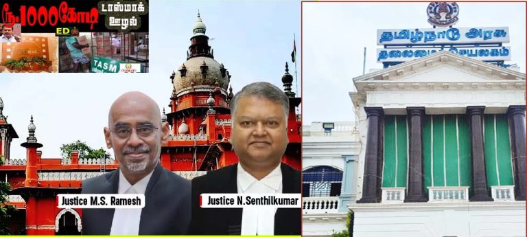 சென்னை அமலாக்கத்துறையின் ரெய்டு தொடர்பான டாஸ்மாக் வழக்கில், தமிழ்நாடு அரசின் நடவடிக்கை மீது அதிருப்தி தெரிவித்துள்ள உயர்நீதிமன்றம், தமிழ்நாடு அரசு சட்ட நடைமுறையை தவறாக பயன்படுத்துகிறது, உயர்நீதிமன்றத்தை அவமானப்படுத்துகிறது என பல்வேறு கேள்விகளை எழுப்பி உள்ளது. அமலாக்கத்துறையினர் டாஸ்மாக் தலைமை அலுவலகத்தில் கடந்த மார்ச் 6-ந்தேதி முதல் 8-ந்தேதி வரை அமலாக்கத்துறையினர் 3 நாட்கள் அதிரடி சோதனை நடத்தினர். சோதனை தொடர்பாக அமலாக்கத்துறை வெளியிட்ட அறிக்கையில், முதற்கட்டமாக ரூ.1000 கோடி அளவுக்கு முறைகேடு நடந்திருப்பது தெரிய வந்துள்ளது … Continue reading தமிழ்நாடு அரசு உயர் நீதிமன்றத்தை அவமானப்படுத்துகிறது – சட்ட நடைமுறையை தவறாக பயன்படுத்துகிறது! டாஸ்மாக் வழக்கில் நீதிபதிகள் அதிருப்தி…