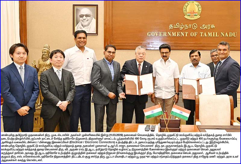 முதலமைச்சர் திரு. மு.க. ஸ்டாலின் அவர்கள் முன்னிலையில் இன்று (11.03.2026) தலைமைச் செயலகத்தில், தொழில், முதலீட்டு ஊக்குவிப்பு மற்றும் வர்த்தகத் துறை சார்பில் நடைபெற்ற நிகழ்ச்சியில், ஜப்பான் நாட்டைச் சேர்ந்த ஹிரோசே நிறுவனம், திருவள்ளூர் மாவட்டம், பூந்தமல்லியில் 100 கோடி ரூபாய் உறுதியளிக்கப்பட்ட முதலீடு மற்றும் 100 நபர்களுக்கு வேலைவாய்ப்பு அளிக்கும் வகையில், மின்சார / மின்னணு இணைப்பிகள் (Electrical / Electronic Connectors) உற்பத்தித் திட்டம் அமைப்பதற்கு புரிந்துணர்வு ஒப்பந்தம் மேற்கொள்ளப்பட்டது.