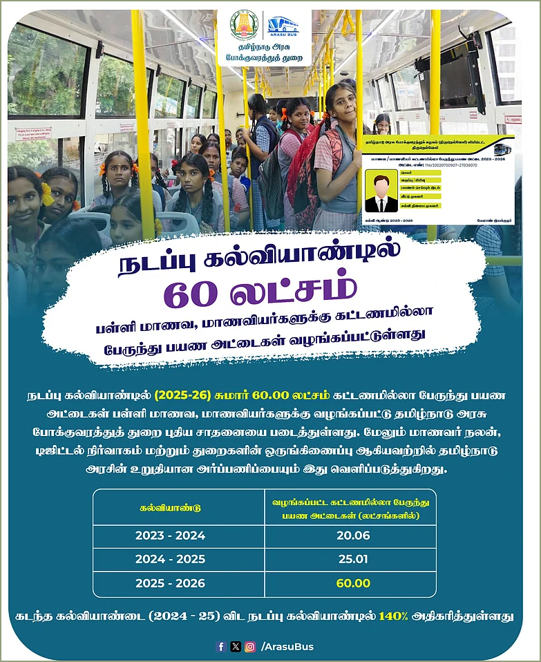 தமிழ்நாடு அரசு போக்குவரத்துக் கழகம் நடப்பு கல்வி ஆண்டில் (2025-26) பள்ளி மாணவ, மாணவியர்களுக்கு 60 லட்சம் கட்டணமில்லா பேருந்து பயண அட்டைகளை வழங்கி புதிய சாதனை படைத்துள்ளது.