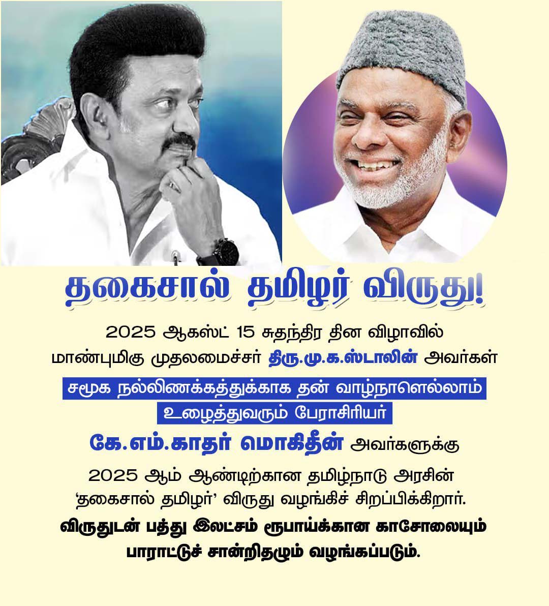 ‘தகைசால் தமிழர் விருது’க்கு தேர்ந்தெடுக்கப்பட்டுள்ள கே.எம். காதர் மொகிதீனுக்கு, ரூ.10 லட்சத்திற்கான காசோலையும் பாராட்டுச் சான்றிதழும் வருகிற ஆகஸ்ட் 15-ஆம் நாள் நடைபெறும் சுதந்திர தின விழாவில் தமிழ்நாடு முதலமைச்சர் மு.க. ஸ்டாலினால் வழங்கப்படும்.