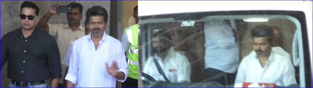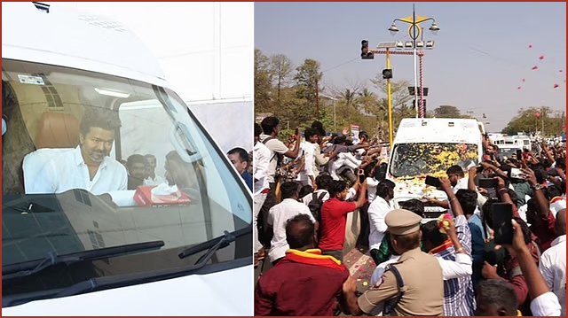 முன்னதாக, இன்று காலை சென்னையில் இருந்து திருச்சி சென்ற விஜய், அங்கிருந்து வாகனத்தில் தஞ்சாவூர் சென்றார்.  ஏற்கெனவே தனது வாகனத்தை யாரும் பின்தொடர வேண்டாம் என்று விஜய் கேட்டுக் கொண்டிருந்த நிலையில், தஞ்சை சாலையில் முக்கிய இடங்களில் விஜய்யை பார்க்க மக்கள் திரண்டுள்ளனர். துவாக்குடி சுங்கச் சாவடி அருகே விஜய்யின் வாகனம் வந்தபோது, விஜய்யின் வாகனத்தை தொண்டர்கள் சூழ்ந்தனர். தொடர்ந்து வாகனத்தின் வேகத்தை குறைத்து, தொண்டர்களுக்கு விஜய் கையசைத்து சென்றார்.