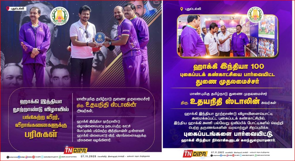 தமிழ்நாடு துணை முதலமைச்சர் உதயநிதி ஸ்டாலின் நேற்று (7.11.2025) புதுடெல்லியில் ஹாக்கி இந்தியா நூற்றாண்டு விழாவினையொட்டி நடைபெற்ற காட்சிப் போட்டியில் பங்கேற்ற இந்தியாவின் முன்னணி ஹாக்கி விளையாட்டு வீரர், வீராங்கனைகளுக்கு பரிசுகளை வழங்கினார்.