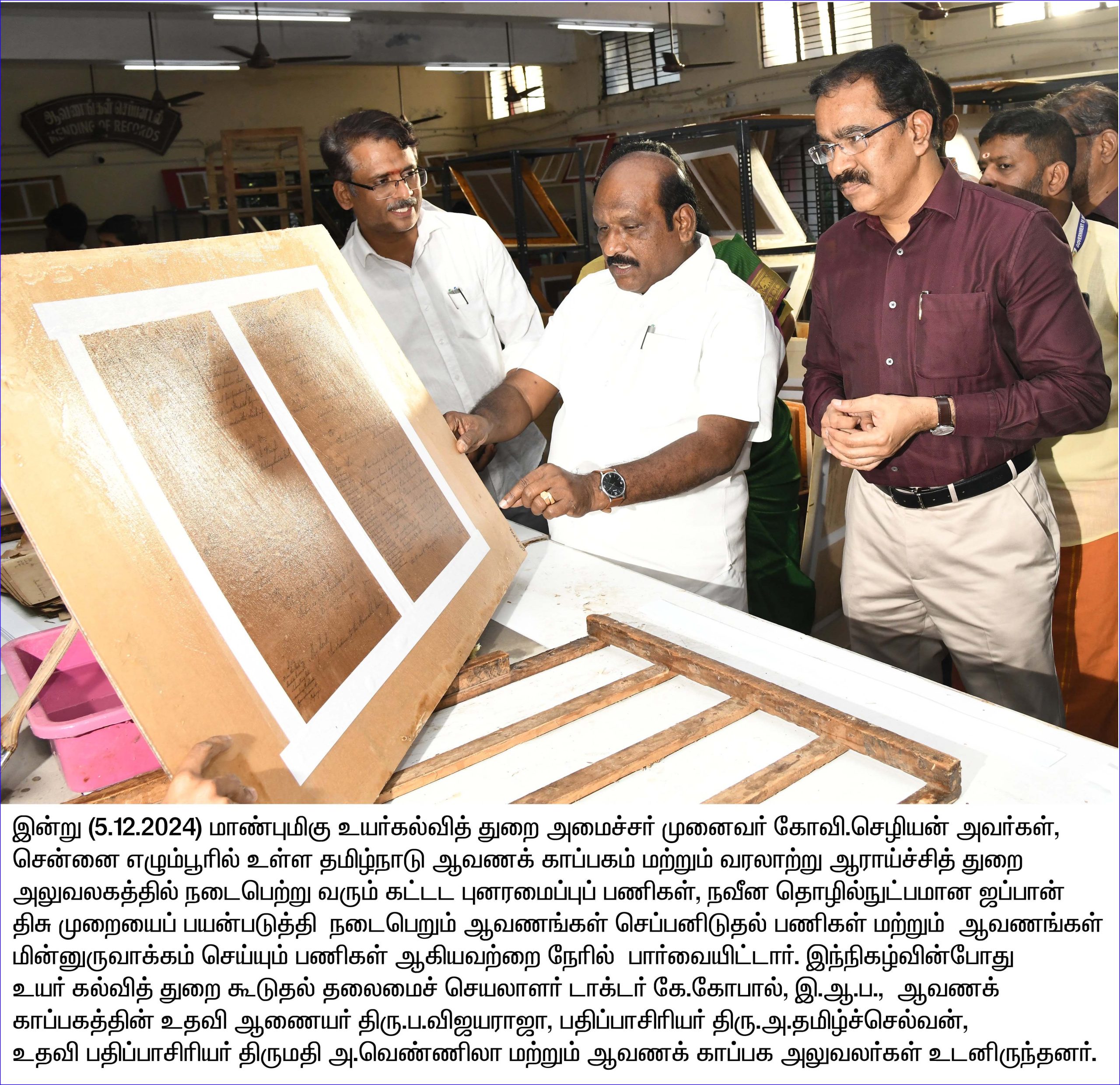 தமிழ்நாடு ஆவணக் காப்பகம் மற்றும் வரலாற்று ஆராய்ச்சித் துறை மற்றும் தமிழ்நாடு அறிவியல் தொழில்நுட்ப மையம் ஆகியவற்றை உயர்கல்வித்துறை அமைச்சர் கோவி.செழியன் நேரில் ஆய்வு செய்தார். பின்னர் செய்தியளார்களை சந்தித்தபோது, 2007ல் கலைஞர் வரலாற்று ஆவணங்களை காக்க வேண்டும் என்ற நோக்கத்தோடு வரலாற்று ஆவணங்களை பராமரிக்க ரூ.5 கோடி நிதி ஒதுக்கீடு செய்தார். அதன்பின் வந்தவர்கள் இதை கண்டுகொள்ளவில்லை.