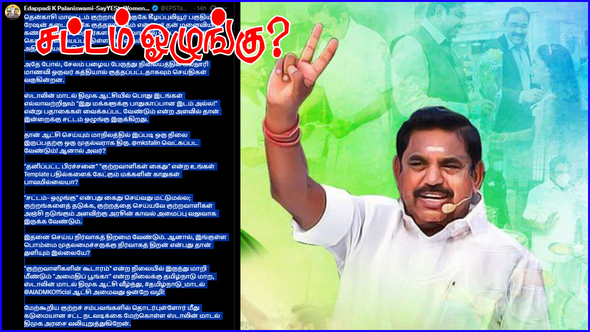 சென்னை: ஸ்டாலின் மாடல் திமுக ஆட்சியில் பொது இடங்கள் எல்லாவற்றிலும் “இது மக்களுக்கு பாதுகாப்பான இடம் அல்ல!” என்று பதாகைகள் வைக்கப்பட வேண்டும் என்ற அளவில்தான் இன்றைக்கு சட்டம் ஒழுங்கு இருக்கிறது என எதிர்க்கட்சி தலைவரும், முன்னாள் முதல்வருமான எடப்பாடி பழனிச்சாமி கடுமையாக விமர்சித்துள்ளார்.