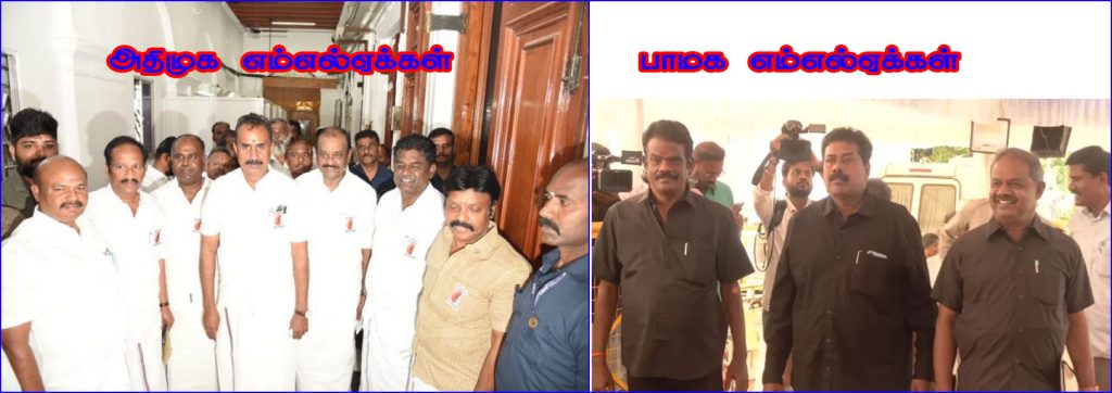 சட்டப்பேரவை பாமக குழு தலைவர் பதவியில் இருந்து ஜி.கே.மணியை நீக்க வேண்டும். எம்எல்ஏ அருளின் கொறடா பதவியை பறிக்க வேண்டும். தருமபுரி எம்எல்ஏ வெங்கடேஸ்வரனைபேரவை பாமக குழு தலைவராகவும், மயிலம் எம்எல்ஏ சிவகுமாரை கொறடாவாகவும் நியமிக்க வேண்டும் கோஷமிட்டனர். இது தொடர்பாக ஏற்கெனவே பேரவை தலைவரிடம் கடிதம் கொடுத்தும், எந்த நடவடிக்கையும் எடுக்கவில்லை. இந்த நிலையில், அவர்களும் அவையில் பேச முயற்சி செய்வார்கள் என எதிர்பார்க்கப்படுகிறது.