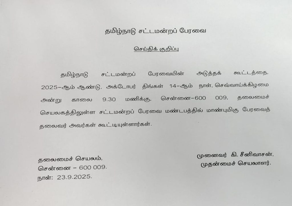 இது தொடர்பாக தலைமை செயலகம் வெளியிட்டுள்ள செய்தி குறிப்பில், “தமிழ்நாடு சட்டமன்றப் பேரவையின் அடுத்தக் கூட்டத்தை 2025-ஆம் ஆண்டு, அக்டோபர் திங்கள் 14-ஆம் நாள், செவ்வாய்க்கிழமை அன்று காலை 9.30 மணிக்கு. சென்னை தலைமைச் செயலகத்திலுள்ள சட்டமன்றப் பேரவை மண்டபத்தில் மாண்புமிகு பேரவைத் தலைவர் அவர்கள் கூட்டியுள்ளார்கள்” என்று தெரிவிக்கப்பட்டுள்ளது.