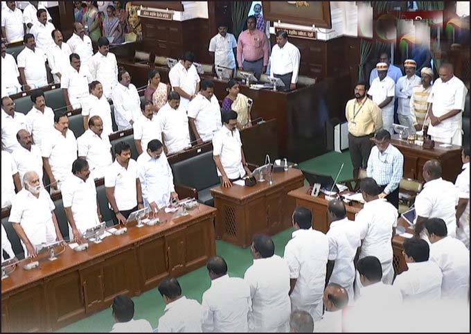 இந்த நிலையில், இன்று பேரவை கூடியதும் முன்னாள் உறுப்பினர்களின் மறைவுக்கு இரங்கல் குறிப்பு வாசிக்கப்பட்டது. முன்னாள் எம்.எல்.ஏ.க்கள் புரட்சிமணி, குணசேகரன், கோவிந்தசாமி, அமர்நாத், அறிவழகன், ராமலிங்கம், கலுலுர் ரஹ்மான், சின்னசாமி மறைவுக்கு இரங்கல் குறிப்பு வாசிக்கப்பட்டது. தொடர்ந்து.கரூரில் கூட்ட நெரிசலில் சிக்கி உயிரிழந்த 41 பேருக்கு இரங்கல் தீர்மானம் வாசிக்கப்பட்டது. இதைடுத்து அவை உறுப்பினர்கள் எழுந்து நின்று மவுன அஞ்சலி செலுத்தினர்.
