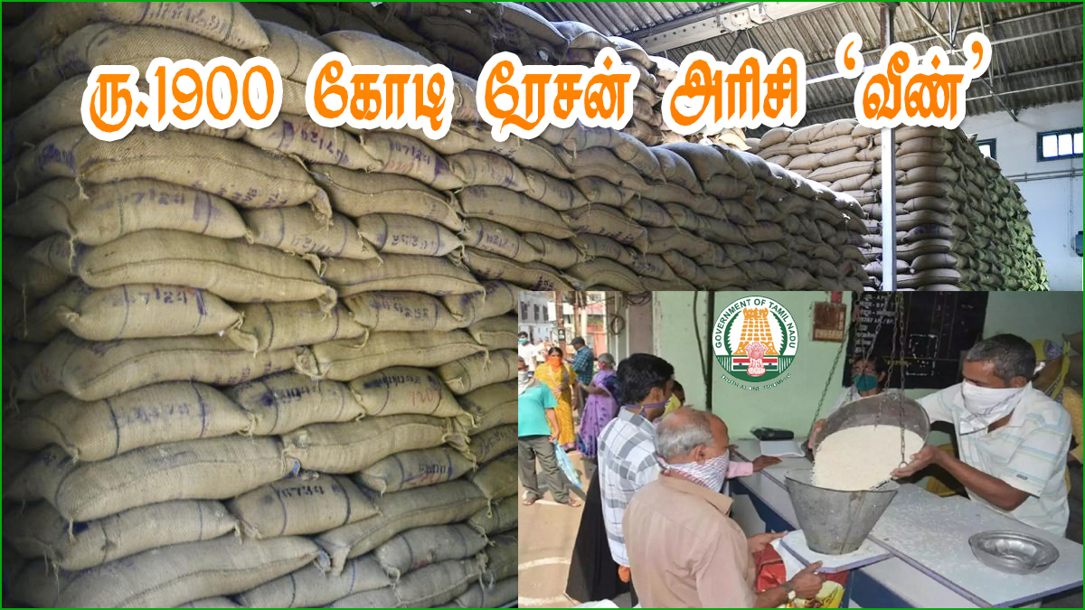 இந்த நிலையில், ரேசன் கடைகளுக்கு அனுப்பப்படும் அரிசி ஏற்றி இறக்குவதிலும், எலி போன்ற ஐந்துகள் சாக்கு மூட்டைகளை கடித்து சேதப்படுத்துவதாலும் ஆயிரக்கணக்கான கிலோ அரிசிகள் வீணாகி வருகிறது. இதன் காரணமாக 2022-23 ஆம் ஆண்டில் மட்டும் ரூ.1900 கோடி மதிப்பிலான ரேசன் அரிசி வீணானதாக தமிழ்நாடு அரசு அதிர்ச்சி தகவலை தெரிவித்துள்ளது. இது மக்களிடையே அதிர்ச்சியையும், வியப்பையும் ஏற்படுத்தி உள்ளது.