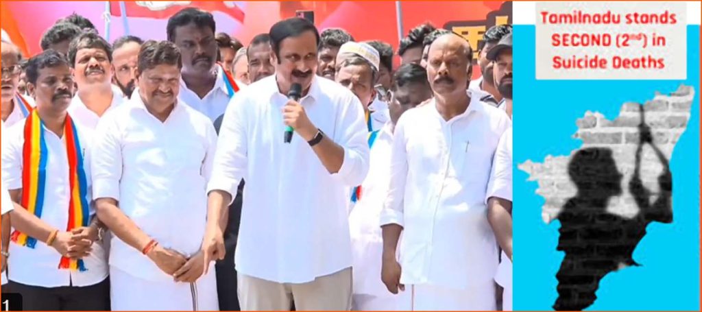 சென்னை: தற்கொலைகளின் பூமி தமிழ்நாடு  என விமர்சித்துள்ள பாமக தலைவர்  அன்புமணி, மது, கஞ்சா போதைதான் முதன்மைக் காரணம்’’ என்றும், 71 சதவிகித தற்கொலைகளுக்கு  மது கஞ்சா போதையே காரணம் என்றும்  புள்ளிவிவரங்களுடன் விமர்சித்துள்ளார்.