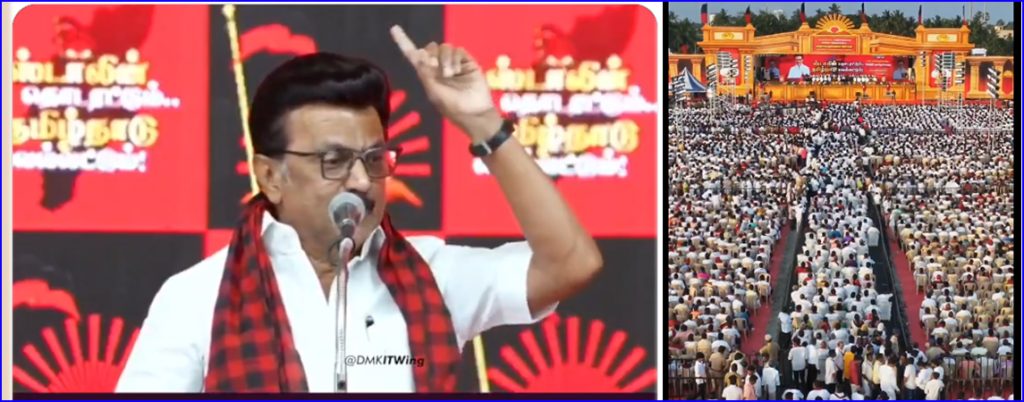 சொன்னபடியே உழைத்துக் கொண்டு இருக்கிறேன்! நான் மட்டுமா உழைக்கிறேன்… இங்கு மேடையில் இருக்கும் மாவட்டச் செயலாளர்களானாலும் சரி, நிர்வாகிகளானாலும் சரி, பூத் அளவில் இருக்கும் நீங்களும் சரி, ஓய்வில்லாமல்தான் உழைத்துக் கொண்டு இருக்கிறீர்கள்! இந்தியாவில் வேறு எந்தக் கட்சியும் இவ்வாறு வேலை செய்யாது. இவ்வாறு நாம் உழைக்கும் காரணத்தினால்தான், தமிழ்நாடும் நம்பர் ஒன்-ஆக இருக்கிறது! திராவிட முன்னேற்றக் கழகமும் நம்பர் ஒன்-ஆக இருக்கிறது!