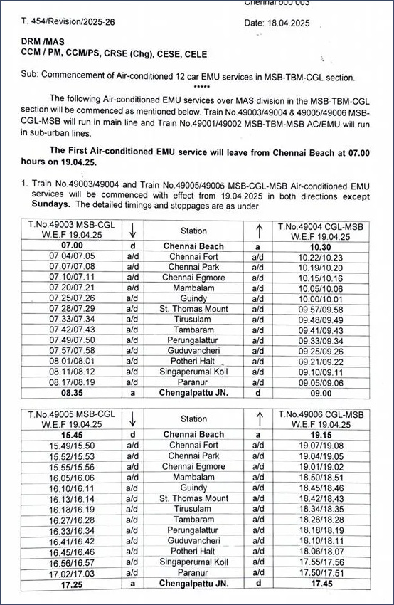 தற்போது,  சென்னை ரெயில்வே கோட்டத்தின் கீழ் நாள்தோறும் 600-க்கும் மேற்பட்ட மின்சார ரெயில் சேவைகள் இயக்கப்பட்டு வருகின்றது. இதற்கிடையே, கோடை காலத்தில் வெயிலால் பயணிகள் சிரமம் அடைவதை தவிர்க்கும் வகையில், மின்சார ரெயில்களில் ஏ.சி. பெட்டிகளை இணைத்து இயக்க வேண்டும் என பயணிகள் நீண்ட நாட்களாக கோரிக்கை விடுத்து வந்தனர்.