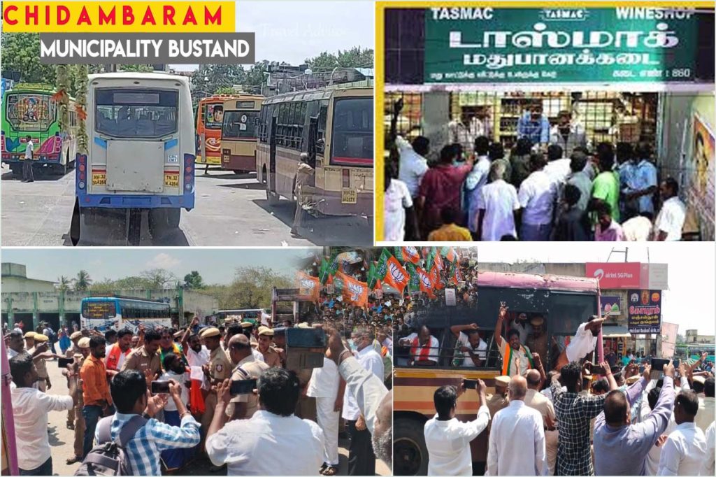 சிதம்பரம் பேருந்து நிலையம் அருகே 2 டாஸ்மாக் கடைகள் இயங்கி வருகிறது.  இதனால் அந்த பகுதியில் போக்குவரத்து நெரிசல் ஏற்படுவதுடன், கோவிலுக்கு வரும் பக்தர் களுக்கு சிரமங்கள் ஏற்படுகிறது. மேலும்,  மது பிரியர்களால் அடிக்கடி சட்டம் ஒழுங்கு பிரச்சினைகள் ஏற்பட்டு வருகிறது.  இதனால் அந்த டாஸ்மாக் கடைகளை அகற்றக்கோரி பலமுறை மனு கொடுத்தும் அரசு மற்றும் காவல்துறையினர் எந்தவொரும் நடவடிக்கை எடுக்கவில்லை. அந்த  டாஸ்மாக் கடைகளை அகற்ற வேண்டும் என்று அரசியல் கட்சியினர் மற்றும் பல்வேறு அமைப்பினர் தொடர்ந்து போராட்டத்தில் ஈடுபட்டும், அரசு உயர் அதிகாரிகளுக்கு மனு அளித்தும் அதை திமுக அரசு கண்டுகொள்ள வில்லை8 என கூறப்படுகிறது.