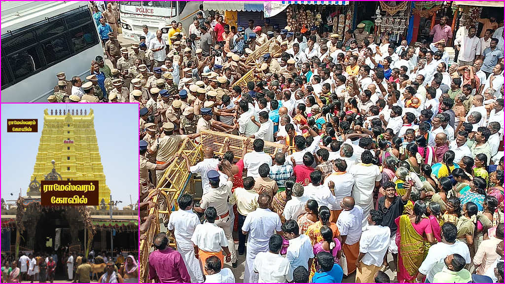 ராமேஸ்வரம் மக்களின் ராமநாதசுவாமி கோயில் வழிபாட்டு உரிமை மீட்க கோரி கோயில் நுளைவு போராட்டம் இன்று நடைபெற்றது. காவல்துறையினரின் தடுப்புகளை தாண்டி 500 க்கும் மேற்பட்டவர்கள் சென்ற நிலையில், அவர்களை மறித்து காவல் துறையினர் கைது செய்தனர். இதனால் அங்கு பரபரப்பு நிலவி வருகிறது.