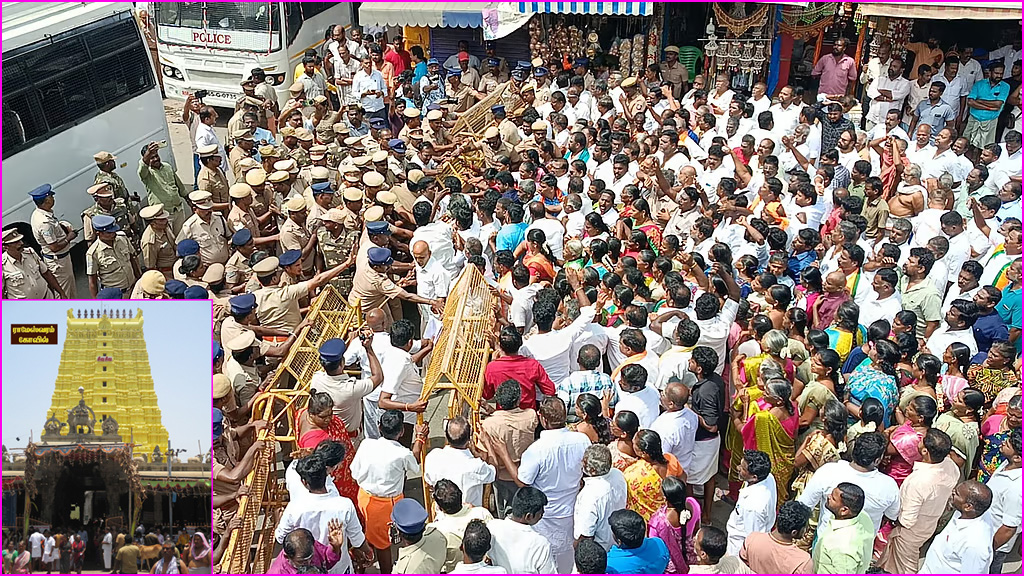 கோவில் நிர்வாகத்தின் இந்த போக்கை கண்டித்து இன்று கோவிலில் நுழைவு போராட்டம் நடைபெறும் அறிவிக்கப்பட்டிருந்தது. இதன்காரணமாக கோவில் நுழைவுவாயிலில் இன்று காலை தடுப்புகள் அமைத்து 100-க்கும் மேற்பட்ட போலீசார் குவிக்கப்பட்டனர்.