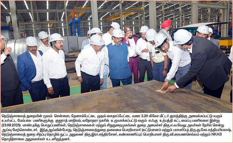 சென்னை தேனாம்பேட்டை முதல் சைதாப்பேட்டை வரை, 3.20 கி.மீ. நீளத்திற்கு ரூ.621 கோடி மதிப்பீட்டில் உயர் மட்ட மேம்பாலம் அமைக்கப்பட்டு வருகிறது. பணியை விரைவில், தரமான முறையில் நிறைவு செய்யும் வகையில், முன்னோக்கிய கட்டமைப்பு (Pre-fabricated) முறையில், சுமார் 15,000 டன் எஃகுக் கட்டமைப்புகள் (Pier, Pier-Cap, Girder) உருவாக்கப்பட்டு வருகின்றன. உற்பத்தி பணிகள் வதோதரா, ஹைதராபாத் உள்ளிட்ட நகரங்களில் உள்ள 5 தொழிற்சாலைகளில் நடைபெற்று வருகின்றன. இப்பணிகளை தமிழ்நாடு பொதுப்பணிகள், நெடுஞ்சாலைகள் மற்றும் சிறு துறைமுகங்கள் துறை அமைச்சர் எ.வ.வேலு அவர்கள் இன்று (23.09.2025) முன்னேற்றப் பணிகளை நேரில் ஆய்வு செய்து, உற்பத்தி தரத்தையும், பணிகளை விரைவில் முடிக்கும் பொருட்டு, நேரில் சென்று பார்வையிட்டு, ஆய்வு மேற்கொண்டார்.