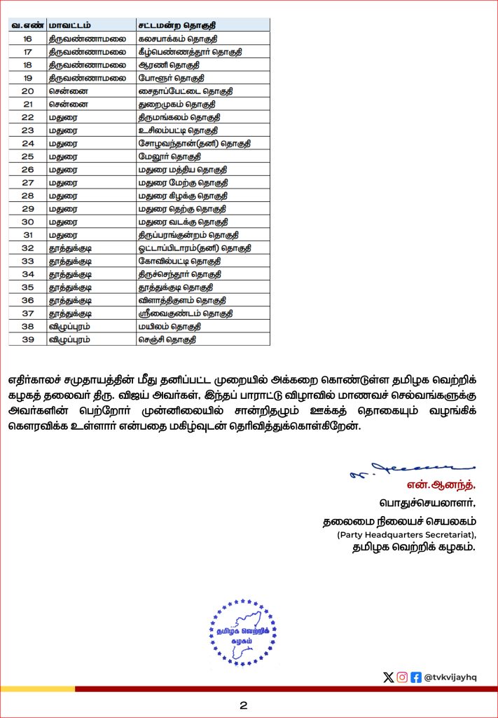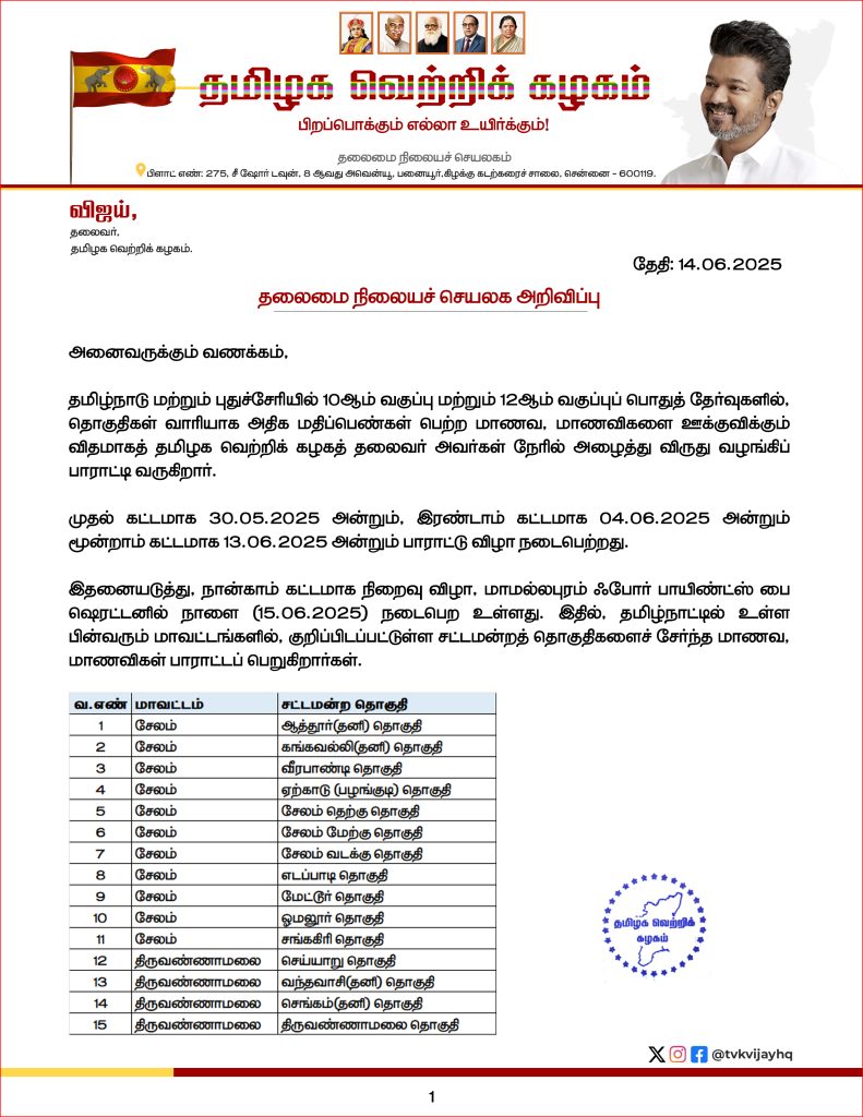 அரசியல் கட்சியை தொடங்கி உள்ள நடிகர், தனது கட்சயின தமிழக வெற்றிக்கழகத்தின் சார்பில், 10, 12-ம் வகுப்பு தேர்வில் அதிக மதிப்பெண் பெற்ற மாணவ, மாணவிகளுக்கு பரிசு வழங்கி கவுரவித்து வருகிறார். இளைய தலைமுறையினரை கவரும் நோக்கில் கடந்த இரு ஆண்டு களாக நடத்தப்பட்டு வரும் இந்த விழா, நடப்பாண்டும் ( 2025) மாமல்லபுரத்தில் உள்ள தனியார் ஓட்டலில் நடத்தப்பட்டு வருகிறது.