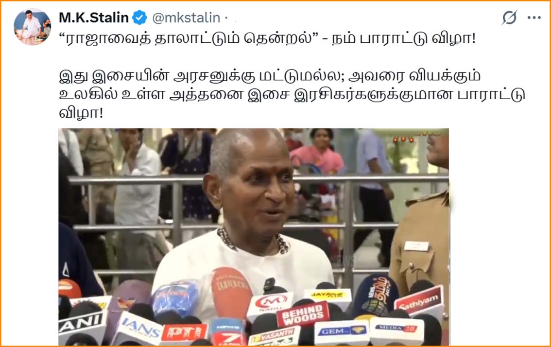 இது குறித்து, எக்ஸ் தளத்தில் அவா் புதன்கிழமை வெளியிட்ட பதிவில், ராஜாவைத் தாலாட்டும் தென்றலாக வரும் செப். 13-ஆம் தேதி பாராட்டு விழாவை நடத்த உள்ளோம். இது இசையின் அரசனுக்கு மட்டுமல்ல, அவரை வியக்கும் உலகில் உள்ள அத்தனை இசை ரசிகா்களுக்குமான பாராட்டு விழா என்று தனது பதிவில் முதல்வா் தெரிவித்துள்ளாா்.