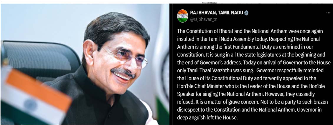 அதில், தமிழ்நாடு சட்டப்பேரவையில் இன்று மீண்டும் பாரதத்தின் அரசியலமைப்பு மற்றும் தேசிய கீதம் அவமதிக்கப்பட்டன. தேசிய கீதத்தை மதித்தல் என்பது நமது அரசியலமைப்பில் வகுக்கப்பட்டுள்ள முதலாவது அடிப்படைக் கடமையாகும். அது அனைத்து சட்டப்பேரவைகளிலும் ஆளுநர் உரையின் தொடக்கத்திலும் முடிவிலும் பாடப்படுகிறது. இன்று ஆளுநர் அவர்கள் பேரவைக்கு வரும்போது தமிழ்த்தாய் வாழ்த்து மட்டும் பாடப்பட்டது. ஆளுநர் அவர்கள் பேரவையிடம் அதன் அரசியலமைப்பு கடமையை மரியாதையுடன் நினைவூட்டியதுடன், தேசிய கீதத்தைப் பாடுவதற்காக அவைத் தலைவரான மாண்புமிகு முதலமைச்சர் அவர்களிடமும் மாண்புமிகு சட்டப்பேரவை சபாநாயகர் அவர்களிடமும் உருக்கமாக வேண்டுகோள் விடுத்தார். ஆனால், அவர்கள் திட்டவட்டமாக மறுத்துவிட்டனர். இது மிகவும் கவலைக்குரிய விஷயமாகும். அரசியல் சாசனம் மற்றும் தேசிய கீதத்தை அப்பட்டமாக அவமதிக்கும் செயல்களுக்கு உடந்தையாக இருந்து விடக்கூடாது என்பதால் ஆளுநர் அவர்கள் கடும் வேதனையுடன் சட்டப்பேரவையை விட்டு வெளியேறினார். என கூறப்பட்டுள்ளது.