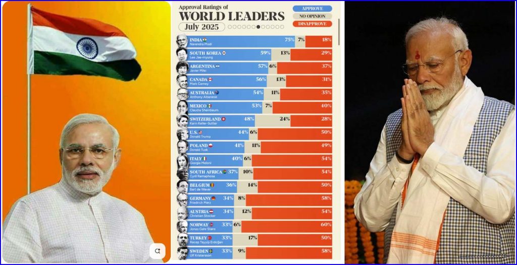 உலகத் தலைவர்களின் ‘ஜனநாயகத் தலைவர் ஒப்புதல் மதிப்பீடுகள்’ பட்டியலில் 75 சதவீதத்துடன் முதலிடத்தைப் பிடித்துள்ளதால், பிரதமர் நரேந்திர மோடி மக்களின் இதயங்களைத் தொடர்ந்து ஆட்சி செய்து, அவர்களின் நம்பிக்கையை அனுபவித்து வருகிறார் என்று அமெரிக்க வணிக நுண்ணறிவு நிறுவனமான மார்னிங் கன்சல்ட் ஜூலை 25ந்தேதி (வெள்ளிக்கிழமை) வெளியிட்ட தரவுகள் தெரிவிக்கின்றன.