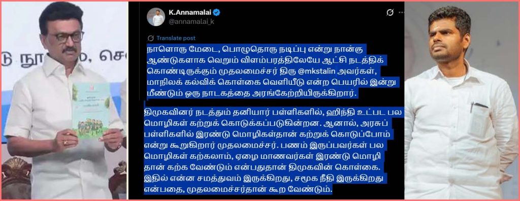 சென்னை: முதலமைச்சர் முக ஸ்டாலின் வெளியிட்ட மாநில கல்வி கொள்கை ஒரு  நாடகம்  என விமர்சித்துள்ள  அண்ணாமலை  திமுக நடத்தும் தனியார் பள்ளிகளில் இந்தி கற்கலாம் என கூறியுள்ளார்.