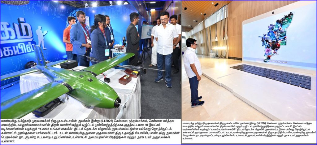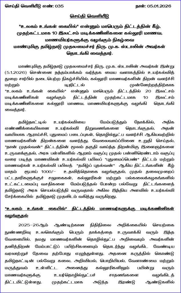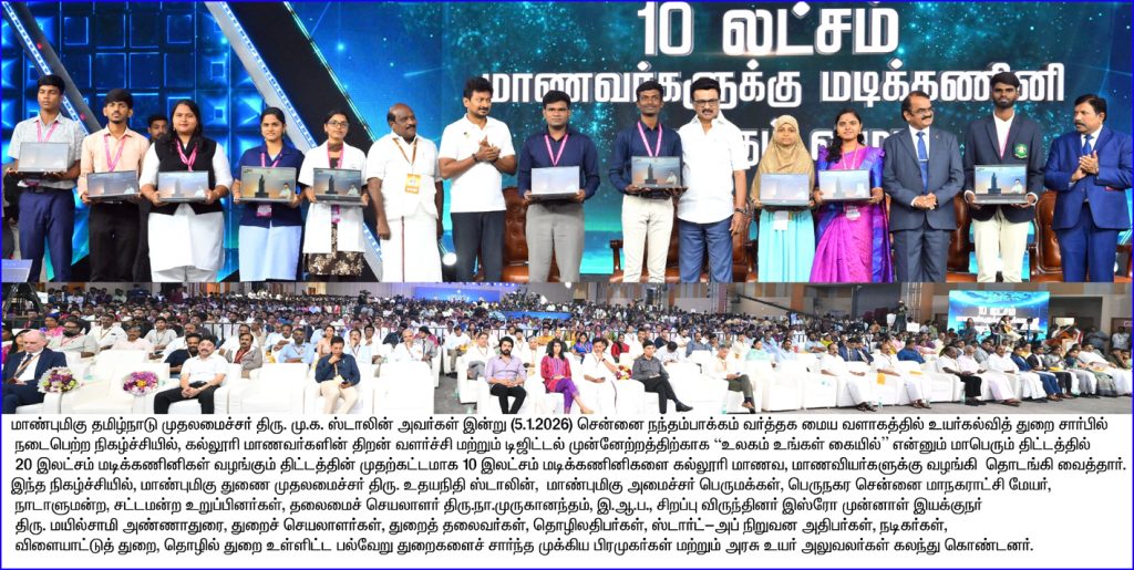 கல்லூரி மாணவர்களின் திறன் வளர்ச்சி மற்றும் டிஜிட்டல் முன்னேற்றத்திற்காக 10 இலட்சம் மடிக்கணினிகள் வழங்கும் “உலகம் உங்கள் கையில்” என்னும் மாபெரும் திட்டத்தை சென்னை வர்த்தக மைய வளாகத்தில் 5.1.2026 திங்கட்கிழமை அன்று மாலை 3 மணியளவில் சென்னை நந்தம்பாக்கத்தில் உள்ள அரங்கில் தொடங்கி வைக்கப்பட்டது. இந்j நிகழ்வில், மாணவர்களுக்கு மடிக்கணினிகளை வழங்கி, இத்திட்டத்தை முதலமைச்சர் மு.க.ஸ்டாலின் தொடங்கி வைத்தார்.