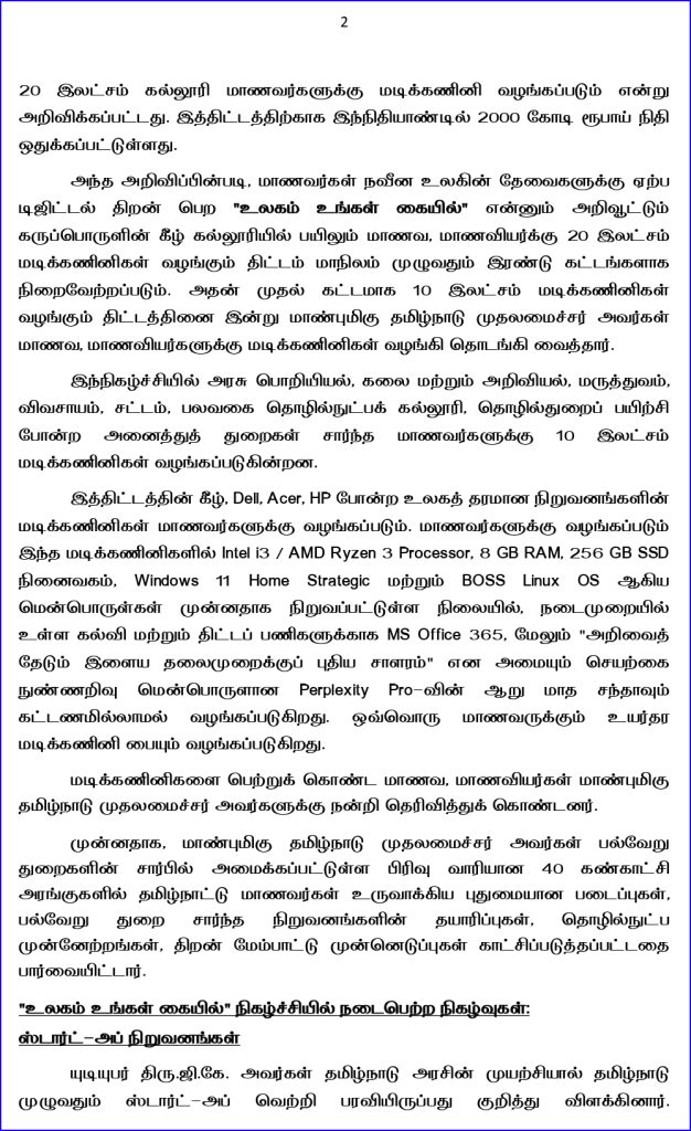 இத்திட்டங்களின் தொடர்ச்சியாக, மாணவர்கள் நவீன உலகின் தேவைகளுக்கு ஏற்ப டிஜிட்டல் திறன் பெற “உலகம் உங்கள் கையில்” என்னும் அறிவூட்டும் கருப்பொருளின் கீழ் கல்லூரியில் பயிலும் மாணவ, மாணவியர்க்கு 20 இலட்சம் மடிக்கணினிகள் வழங்கும் திட்டம் செயல்படுத்தப்படும் என தமிழ்நாடு முதலமைச்சர் மு.க.ஸ்டாலின் அறிவித்தார்கள்.