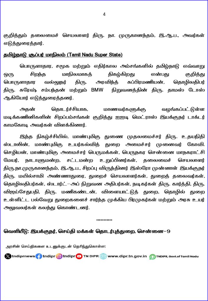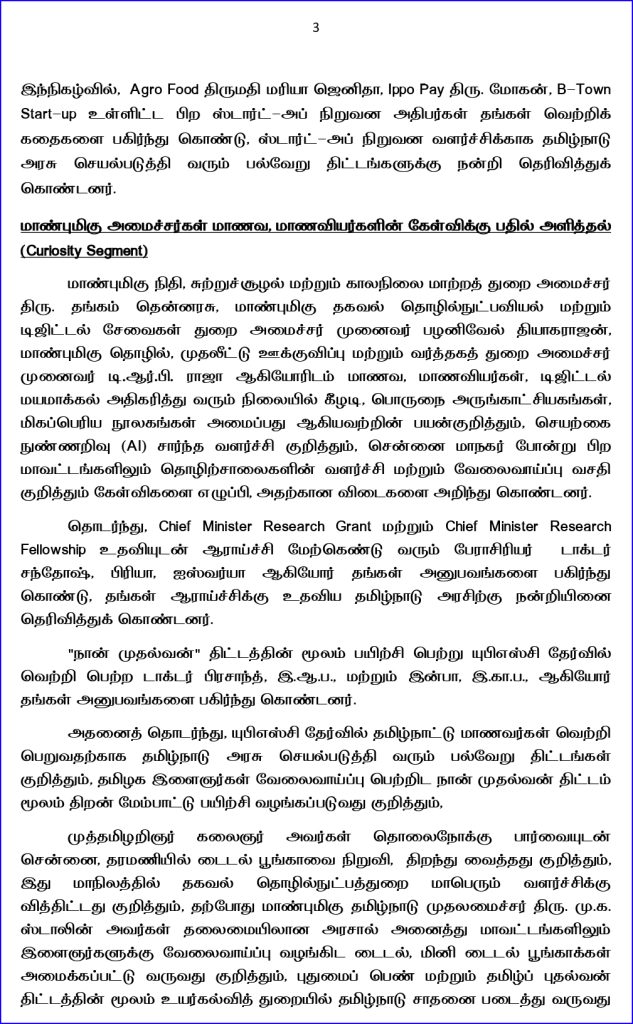 முன்னதாக, சென்னை வர்த்தக மையத்தில் 5.1.2026 அன்று மாலை 3:30 மணி முதல் 6:30 மணியளவு வரையில் 10 இலட்சம் மாணவர்களுக்கு மடிக்கணினி வழங்க உள்ள மாபெரும் நிகழ்வின் முன்னோட்டமாக காலை 9:30 மணி அளவில், தமிழ்நாடு அரசு நடத்தும் இரு நாள் (05.01.2026 முதல் 06.01.2026 வரையிலான) தொழில்நுட்பக் கண்காட்சியை குறு, சிறு மற்றும் நடுத்தரத் தொழில் நிறுவனங்கள் துறை அமைச்சர் தா.மோ.அன்பரசன் அவர்கள் மற்றும் உயர்கல்வித் துறை அமைச்சர் அவர்கள் தொடங்கி வைத்தனர்.