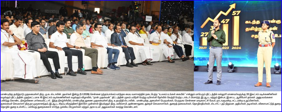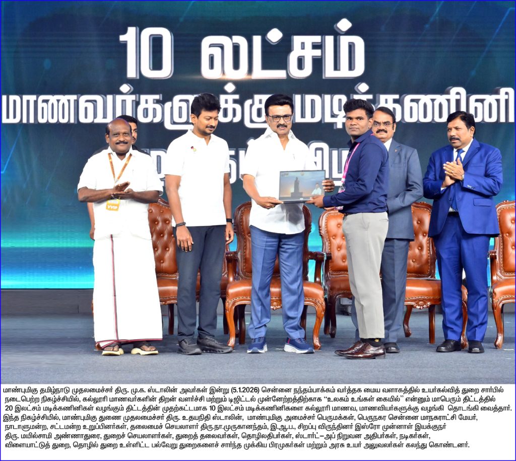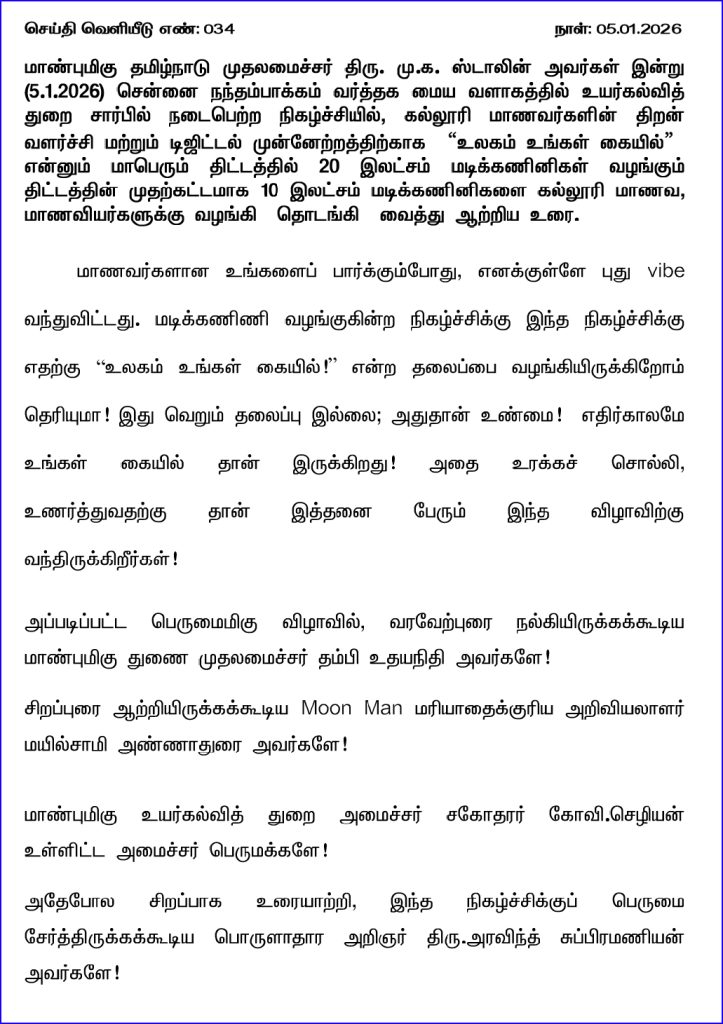 இதுகுறித்து தமிழ்நாடு அரசு வெளியிட்டுள்ள செய்திக்குறிப்பில், தமிழ்நாடு முதலமைச்சர் மு.க. ஸ்டாலின்  5.1.2026  சென்னை நந்தம்பாக்கம் வர்த்தக மைய வளாகத்தில் உயர்கல்வித் துறை சார்பில் நடைபெற்ற நிகழ்ச்சியில், கல்லூரி மாணவர்களின் திறன் வளர்ச்சி மற்றும் டிஜிட்டல் முன்னேற்றத்திற்காக “உலகம் உங்கள் கையில்” என்னும் மாபெரும் திட்டத்தில் 20 இலட்சம் மடிக்கணினிகள் வழங்கும் திட்டத்தின் முதற்கட்டமாக 10 இலட்சம் மடிக்கணினிகளை கல்லூரி மாணவ, மாணவியர்களுக்கு வழங்கி தொடங்கி வைத்து ஆற்றிய உரை:-