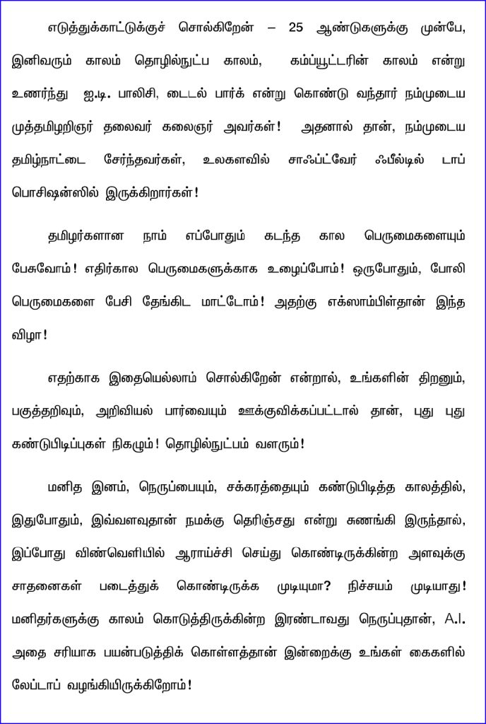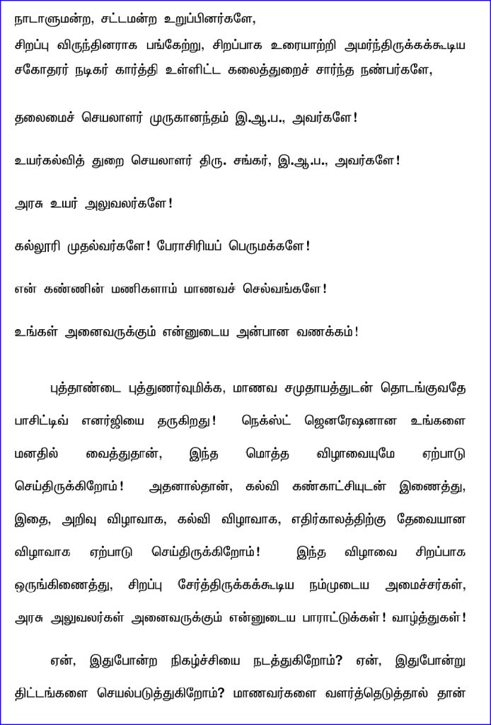 புத்தாண்டை புத்துணர்வுமிக்க, மாணவ சமுதாயத்துடன் தொடங்குவதே பாசிட்டிவ் எனர்ஜியை தருகிறது! நெக்ஸ்ட் ஜெனரேஷனான உங்களை மனதில் வைத்துதான், இந்த மொத்த விழாவையுமே ஏற்பாடு செய்திருக்கிறோம்! அதனால்தான், கல்வி கண்காட்சியுடன் இணைத்து, இதை, அறிவு விழாவாக, கல்வி விழாவாக, எதிர்காலத்திற்கு தேவையான விழாவாக ஏற்பாடு செய்திருக்கிறோம்! இந்த விழாவை சிறப்பாக ஒருங்கிணைத்து, சிறப்பு சேர்த்திருக்கக்கூடிய நம்முடைய அமைச்சர்கள், அரசு அலுவலர்கள் அனைவருக்கும் என்னுடைய பாராட்டுக்கள்! வாழ்த்துகள்!