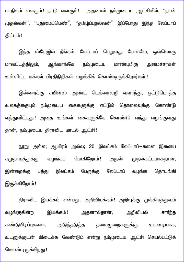 நூறு அல்ல; ஆயிரம் அல்ல; 20 இலட்சம் லேப்டாப்-களை இளைய சமுதாயத்துக்கு வழங்கப் போகிறோம்! அதன் முதல்கட்டமாகதான், இன்றைக்கு பத்து இலட்சம் பேருக்கு லேப்டாப் வழங்க தொடங்கி இருக்கிறோம்!