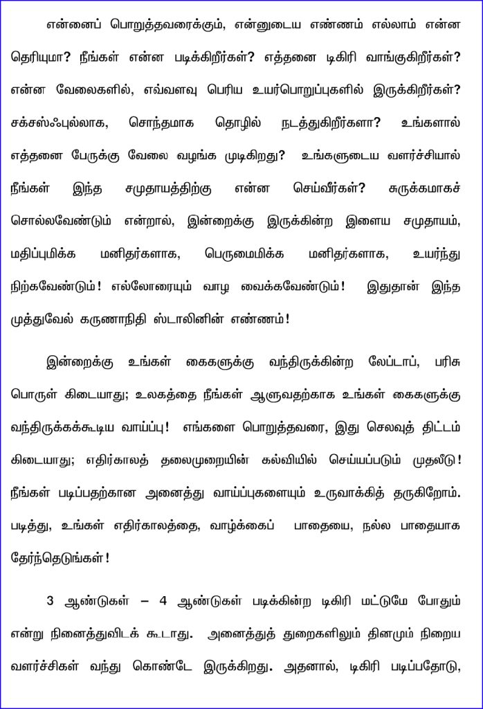 என்னைப் பொறுத்தவரைக்கும், என்னுடைய எண்ணம் எல்லாம் என்ன தெரியுமா? நீங்கள் என்ன படிக்கிறீர்கள்? எத்தனை டிகிரி வாங்குகிறீர்கள்? என்ன வேலைகளில், எவ்வளவு பெரிய உயர்பொறுப்புகளில் இருக்கிறீர்கள்? சக்சஸ்ஃபுல்லாக, சொந்தமாக தொழில் நடத்துகிறீர்களா? உங்களால் எத்தனை பேருக்கு வேலை வழங்க முடிகிறது? உங்களுடைய வளர்ச்சியால் நீங்கள் இந்த சமுதாயத்திற்கு என்ன செய்வீர்கள்? சுருக்கமாகச் சொல்லவேண்டும் என்றால், இன்றைக்கு இருக்கின்ற இளைய சமுதாயம், மதிப்புமிக்க மனிதர்களாக, பெருமைமிக்க மனிதர்களாக, உயர்ந்து நிற்கவேண்டும்! எல்லோரையும் வாழ வைக்கவேண்டும்! இதுதான் இந்த முத்துவேல் கருணாநிதி ஸ்டாலினின் எண்ணம்!