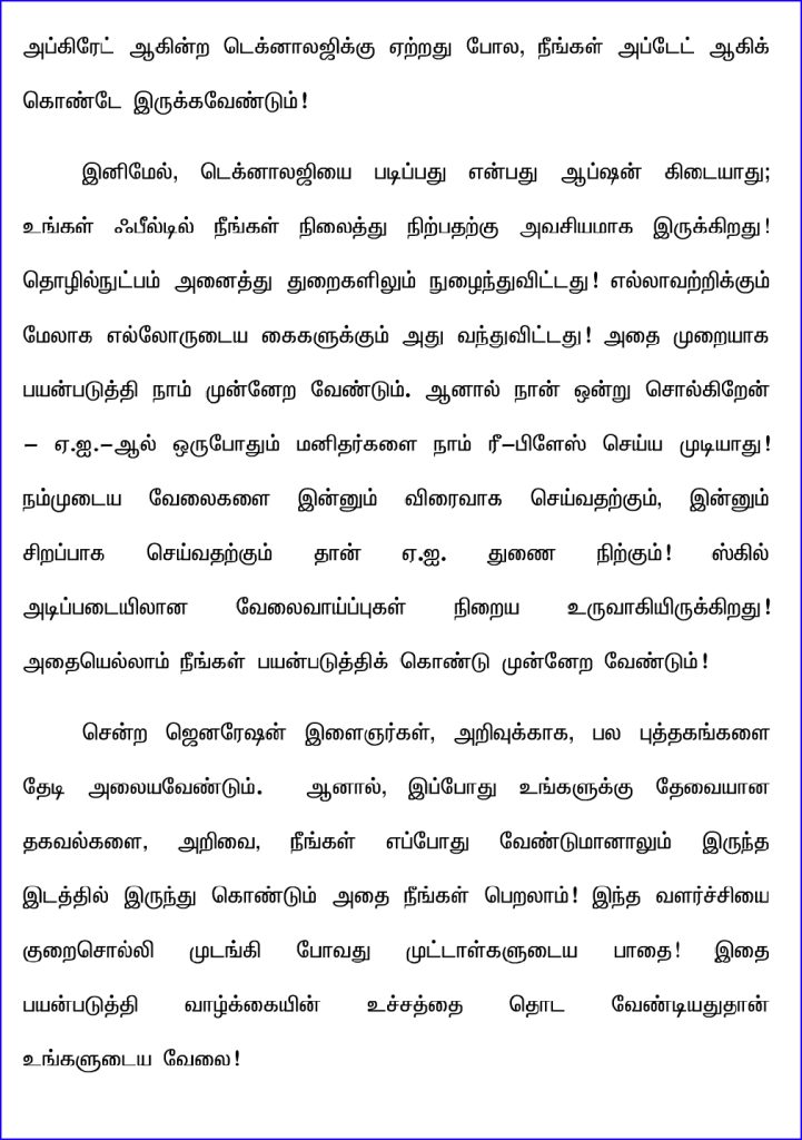 இனிமேல், டெக்னாலஜியை படிப்பது என்பது ஆப்ஷன் கிடையாது; உங்கள் ஃபீல்டில் நீங்கள் நிலைத்து நிற்பதற்கு அவசியமாக இருக்கிறது! தொழில்நுட்பம் அனைத்து துறைகளிலும் நுழைந்துவிட்டது! எல்லாவற்றிக்கும் மேலாக எல்லோருடைய கைகளுக்கும் அது வந்துவிட்டது! அதை முறையாக பயன்படுத்தி நாம் முன்னேற வேண்டும். ஆனால் நான் ஒன்று சொல்கிறேன் – ஏ.ஐ.-ஆல் ஒருபோதும் மனிதர்களை நாம் ரீ-பிளேஸ் செய்ய முடியாது! நம்முடைய வேலைகளை இன்னும் விரைவாக செய்வதற்கும், இன்னும் சிறப்பாக செய்வதற்கும் தான் ஏ.ஐ. துணை நிற்கும்! ஸ்கில் அடிப்படையிலான வேலைவாய்ப்புகள் நிறைய உருவாகியிருக்கிறது! அதையெல்லாம் நீங்கள் பயன்படுத்திக் கொண்டு முன்னேற வேண்டும்!
