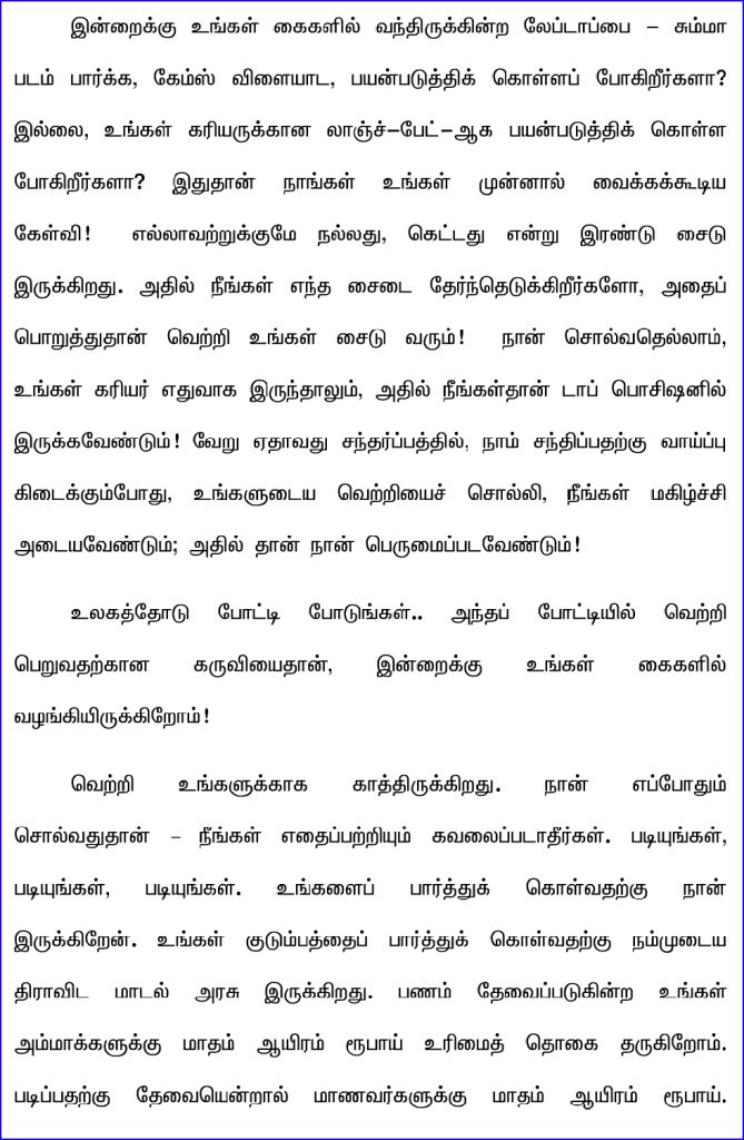 இன்றைக்கு உங்கள் கைகளுக்கு வந்திருக்கின்ற லேப்டாப், பரிசு பொருள் கிடையாது; உலகத்தை நீங்கள் ஆளுவதற்காக உங்கள் கைகளுக்கு வந்திருக்கக்கூடிய வாய்ப்பு! எங்களை பொறுத்தவரை, இது செலவுத் திட்டம் கிடையாது; எதிர்காலத் தலைமுறையின் கல்வியில் செய்யப்படும் முதலீடு! நீங்கள் படிப்பதற்கான அனைத்து வாய்ப்புகளையும் உருவாக்கித் தருகிறோம். படித்து, உங்கள் எதிர்காலத்தை, வாழ்க்கைப் பாதையை, நல்ல பாதையாக தேர்ந்தெடுங்கள்!