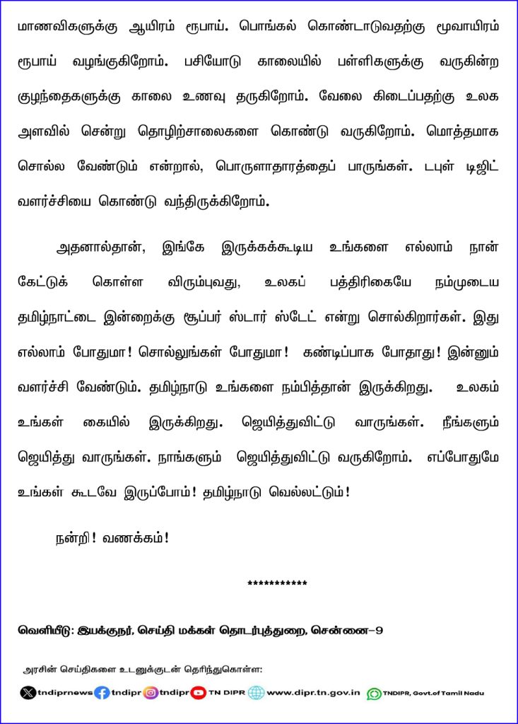 வெற்றி உங்களுக்காக காத்திருக்கிறது. நான் எப்போதும் சொல்வதுதான் – நீங்கள் எதைப்பற்றியும் கவலைப்படாதீர்கள். படியுங்கள், படியுங்கள், படியுங்கள். உங்களைப் பார்த்துக் கொள்வதற்கு நான் இருக்கிறேன். உங்கள் குடும்பத்தைப் பார்த்துக் கொள்வதற்கு நம்முடைய திராவிட மாடல் அரசு இருக்கிறது. பணம் தேவைப்படுகின்ற உங்கள் அம்மாக்களுக்கு மாதம் ஆயிரம் ரூபாய் உரிமைத் தொகை தருகிறோம். படிப்பதற்கு தேவையென்றால் மாணவர்களுக்கு மாதம் ஆயிரம் ரூபாய். மாணவிகளுக்கு ஆயிரம் ரூபாய். பொங்கல் கொண்டாடுவதற்கு மூவாயிரம் ரூபாய் வழங்குகிறோம். பசியோடு காலையில் பள்ளிகளுக்கு வருகின்ற குழந்தைகளுக்கு காலை உணவு தருகிறோம். வேலை கிடைப்பதற்கு உலக அளவில் சென்று தொழிற்சாலைகளை கொண்டு வருகிறோம். மொத்தமாக சொல்ல வேண்டும் என்றால், பொருளாதாரத்தைப் பாருங்கள். டபுள் டிஜிட் வளர்ச்சியை கொண்டு வந்திருக்கிறோம்.