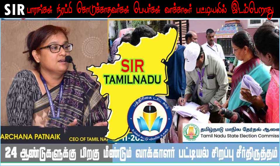 தமிழ்நாட்டில் எஸ்ஐஆர் பணிகள் விறுவிறுப்பாக நடைபெற்று வரும் நிலையில், இதுகுறித்து தமிழ்நாடு தலைமைத் தேர்தல் அதிகாரி அர்ச்சனா பட்நாயக் வெளியிட்டுள்ளார். அதில், , ‘வாக்காளர் சிறப்பு தீவிரத் திருத்த பணியை வெற்றிகரமாக முடிப்பதை உறுதி செய்வதற்காக 38 மாவட்ட தேர்தல் அதிகாரிகள், 234 வாக்காளர் பதிவு அலுவலர்கள், 713 உதவி வாக்காளர் பதிவு அலுவலர்கள், 68,467 வாக்குச்சாவடி நிலை அலுவலர்கள், 7,234 வாக்குச்சாவடி நிலை அலுவலர்கள் மேற்பார்வையாளர்கள் களத்தில் உள்ளனர்.