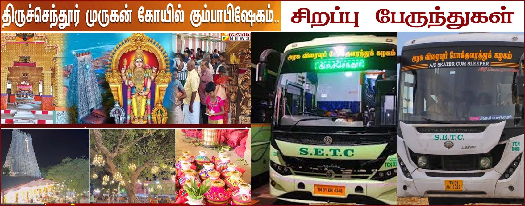 திருச்செந்தூர் கோயில் குடமுழுக்கு விழாவையொட்டி தமிழ்நாட்டின் பல்வேறு நகரங்களில் இருந்தும் திருச்செந்தூருக்கு சிறப்புப் பேருந்துகள் இயக்கப்படுவதாக தமிழ்நாடு அரசு போக்குவரத்துக்கழகம் அறிவித்து உள்ளது.