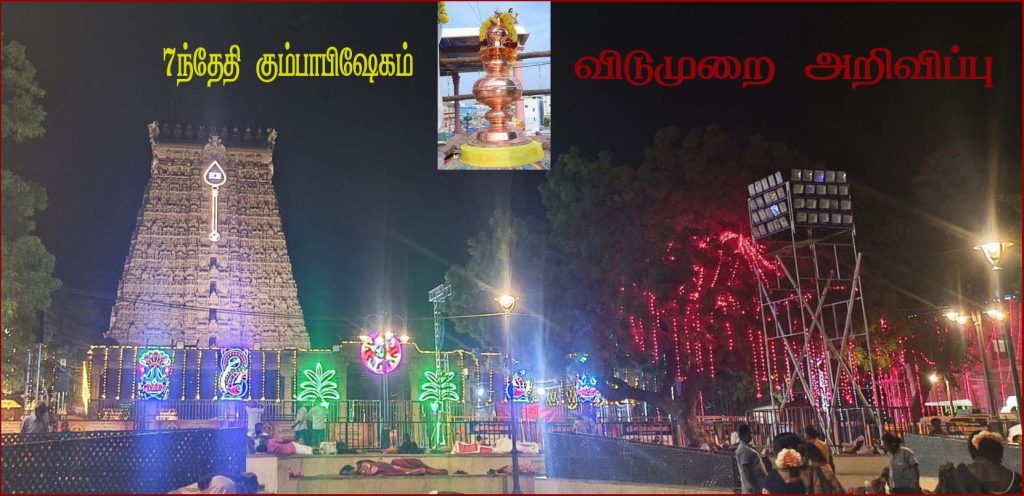 தூத்துக்குடி மாவட்டம் திருச்செந்தூர் அருள்மிகு சுப்ரமணிய சுவாமி திருக்கோவில் குடமுழுக்கு விழா 7ம் தேதி நடைபெறுகிறது. இவ்விழாவை முன்னிட்டு அன்றைய தினம் தூத்துக்குடி மாவட்டத்திற்கு உள்ளூர் விடுமுறை அறிவிக்கப்பட்டு உள்ளது.